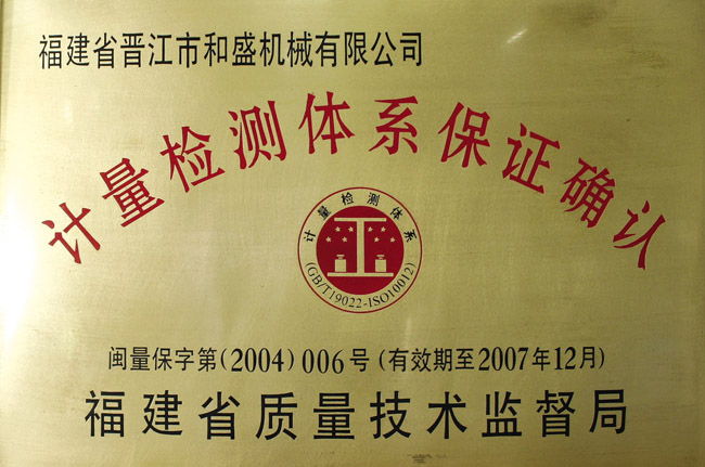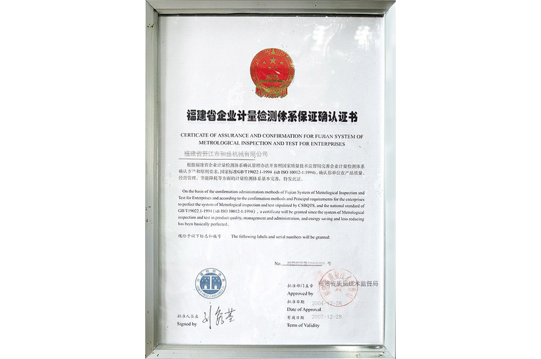 福建省企業(yè)計(jì)量檢測(cè)體系保證確認(rèn)證書(shū)