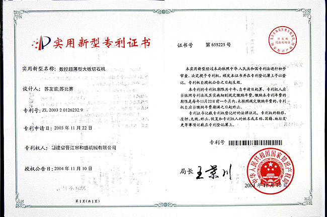 數(shù)控超薄型大板切石機(jī)實(shí)用專利證書