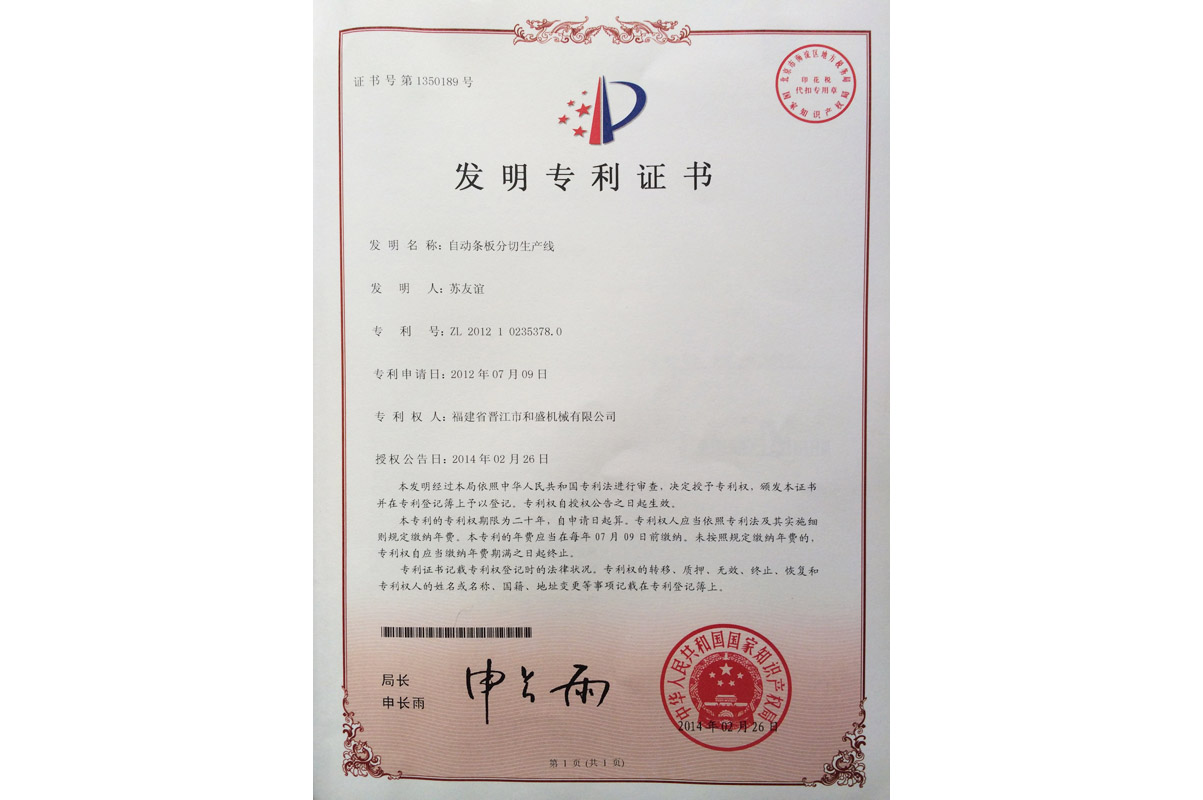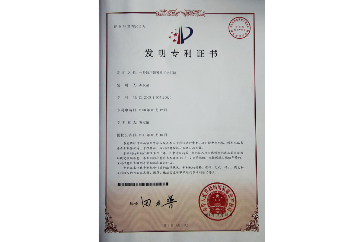雙鎖緊橋式切石機(jī)發(fā)明專利證書