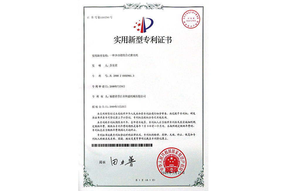 一種多功能組合式磨光機(jī)實(shí)用專利證書